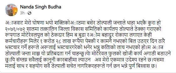 कर्णाली प्रदेशका पूर्व मन्त्री तथा डाेल्पाका प्रदेश सांसद नन्दसिंह बुढाले याे पुल निर्माणमा नक्कली विल बनाइ करी १ कराेड २८ लाख रूपैँया खाएर ठेकेदारले काम नगरेकाे सामाजिक सञ्जालमा लेखेपछि याे विषयले फेरी चर्चा पाएकाे छ । हेर्नुहाेस् उहाँकाे भनाइ जस्ताकाे तस्तैः