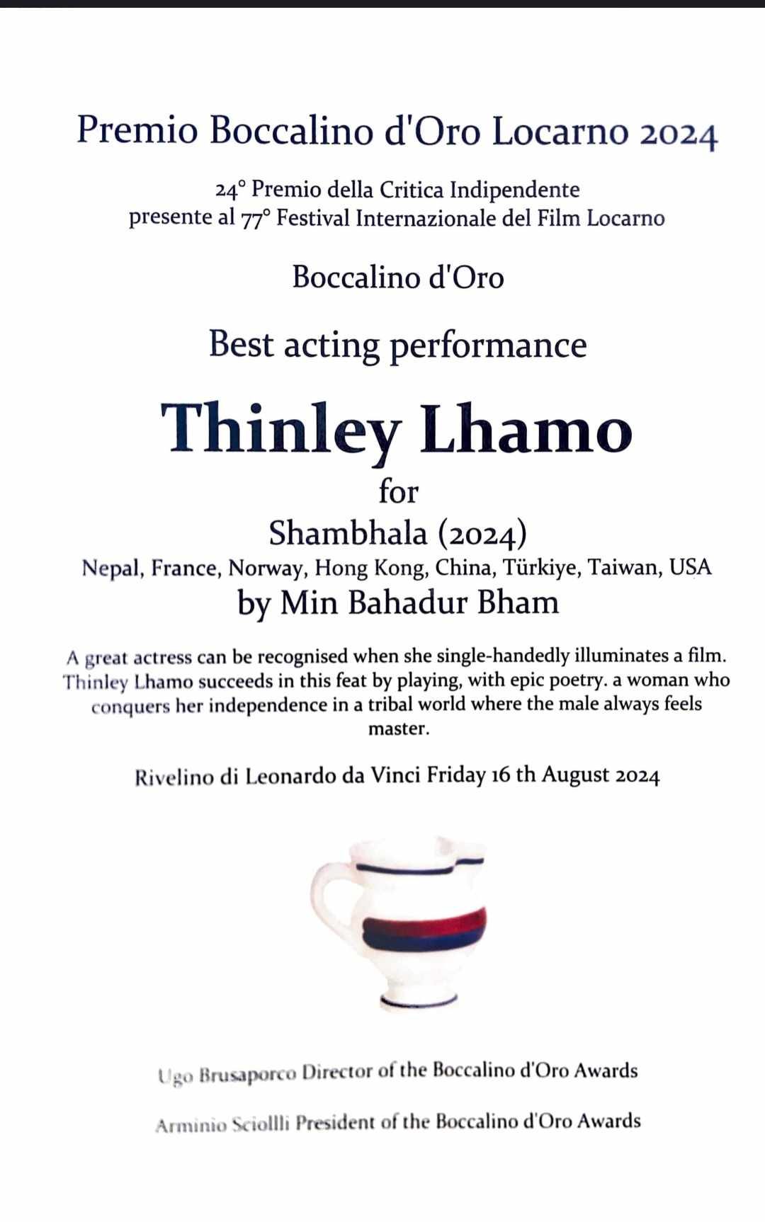 काठमाडौँ —विश्वको चर्चित फिल्म फेस्टिभल लोकार्नो फिल्म फेस्टिभलमा नेपाली कलाकार थिन्ले ल्हामोलाई उत्कृष्ट अभिनयका लागि बोक्कालिनो डिओरु अवार्ड प्रदान गरिएको छ ।