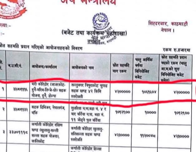 भेरी करिडाेर निर्माण याेजनाका प्रमुख सुनिल रञ्चितकारले तल्लुबगर देखि त्रिपुराकाेटसम्म ४ अर्व २० करोड सुनिश्चित भएकाेले अव चाँडै अन्य काम अगाडी बढ्ने जानकारी दिए। करिडाेरमा हाल दुनै देखि ल्यासिक्यापसम्मकाे सडकमा ट्राक अाेपनकाे काम भइरहेकाे छ भने थप कुनै बजेट भने नभएकाे प्रमुख रञ्जितकारकाे भनाइ छ।