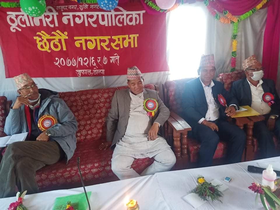 डाेल्पा, डाेल्पाकाे ठुलीभेरी नगरपालिकाकाे छैठाैँ नगरसभा शनिबार नगरपालिकाकाे केन्द्र जुफालमा सम्पन्न भएकाे छ । शुक्रबार देखि शुरूभएकाे नगरसभा २ दिनसम्म चलेकाे थियाे भने सबै जनजसाे प्रतिनिधिकाे समेत उपस्थिति रहेकाे थियाे । नगरसभाकाे उद्घाटन गर्दै नगर प्रमुख गणेश वहादुर शाहिले “संमृद्द नगर,सुखि नगरबासी”काे मुल नारालाइ साकार पार्न लागि परिरहेकाे बताउनुभयाे । नगरपालिकाकाे “संमृद्द नगर,सुखि नगरबासी”काे नारालाइ सफल पार्नमा प्रतिवद्द भएर लाग्न कर्मचारी र जनप्रतिनिधिलाइ आग्रह समेत गर्नुभयाे ।